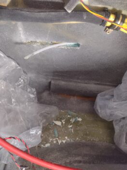 Here I’m in the process of exposing the right rudder cable Nyla-flow conduit, which I cut out about 1-2″ of wall at a time since it has a slight up angle as it travels aft, and the short cutouts allow me to adjust fire as needed.