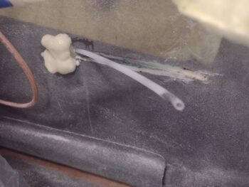 I then used foam scraps and micro to secure the conduit tube aft of these embedded washers, filling the cut out channels back to level with the sidewalls. After they cured for about an hour, I then used a bit of pour foam to fill in aft of the protruding “washers” which will allow me to shape the foam into half conical bumps on the sidewall.