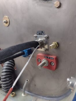 Additionally, in the stainless steel firewall pass-thru for the starter cable and alternator F-lead, I cut a a length of Nyla-flo to serve as a protective sleeve for the F-Lead. You can see that the alternator cable has a black heat shrink anti-chafing sleeve around it. Once the cables were protected from any chafing, I then filled up the gaps around the cable/wire inside the stainless steel pass-thru with gray hi-temp RTV.
