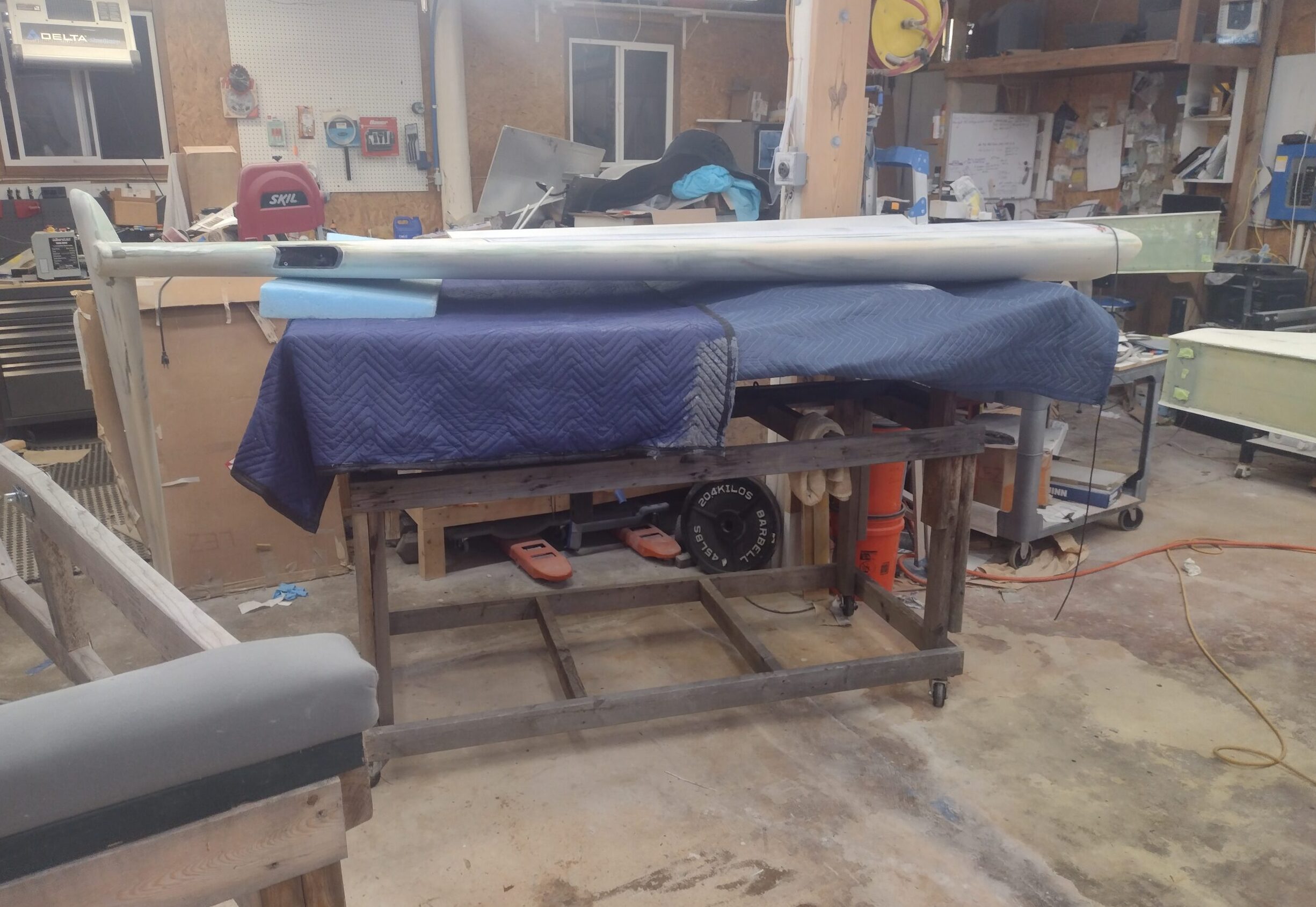 Left wing flipped upside down on other wing cart for fairing finish Published 9 July, 2025 at 2451 × 1689 in Chapter 19/25 – Shop musical chairs