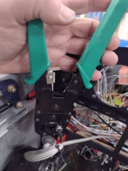 That entailed crimping a new RJ11 connector onto the cut 4-conductor “telephone” wire (the RJ11 visible in the pic above was a test termination). To be clear, online, people have reported their units not functioning as designed when they happen to use actual telephone cabling vs maintaining the original wiring and schema (ie no crossovers).