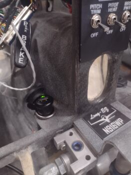 I started off today knocking out a few more power-up circuit tests with the target being the USB and cigarette lighter chargers for both the front pilot seat and the GIB.  Here we have the pilot cigarette lighter charger just forward of the lower instrument panel bulkhead and just to the left of the center panel strut (pic 1).  If you look closely, you can see the green light.  I’ll also point out that this charger is on the battery bus so it’s always hot.