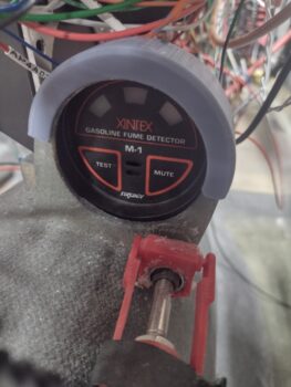 For more than a week now I have been designing and printing out a sleeve that in effect clamps the Fuel Fume Detector onto the AFT side of what was supposed to be its “panel” mount.  However, due to the very short throw on the nose hatch door cable handle release (<1/4″) I felt I should have a positive block to keep from inadvertently ‘popping the hood’ inflight.  That latch handle block intrudes into the space for mounting the fume detector in a normal instrument install fashion.
