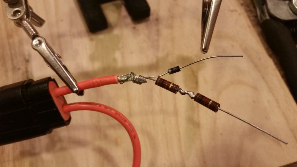 “Starter ON” lead resistors & diode prepped for solder Published 27 January, 2018 at 1000 × 563 in Chapter 22 – “Starter ON” Warning
