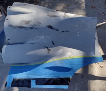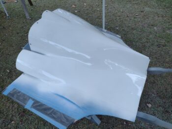 Today I pulled all the protective tape, plastic and paper off the bottom cowl to reveal the black stripes. I had some issues when I shot the sealer (which is exactly why I use it… it’s thin and highlights problem areas before final paint) which I mostly corrected before the paint coats, so I needed to be a bit more diligent in prepping the middle section for blue paint.