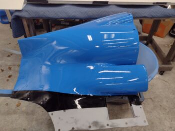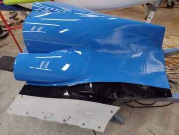 I started off today by pulling up the taped up black stripes and unpainted outboard strips to reveal the just-painted blue cowling along with the black stripes.
