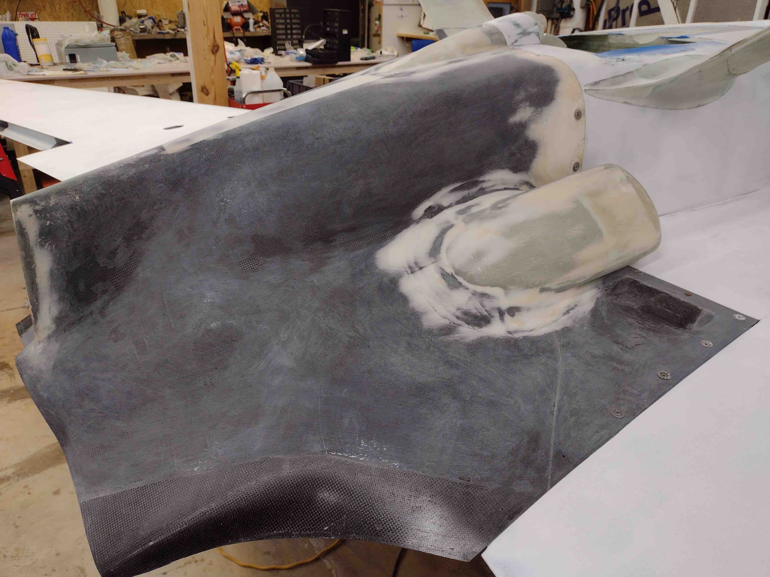 Bottom cowling sanded, remounted for test fit Published 7 November, 2021 at 2560 × 1920 in Chapter 25 – Preppin’ for Primer!