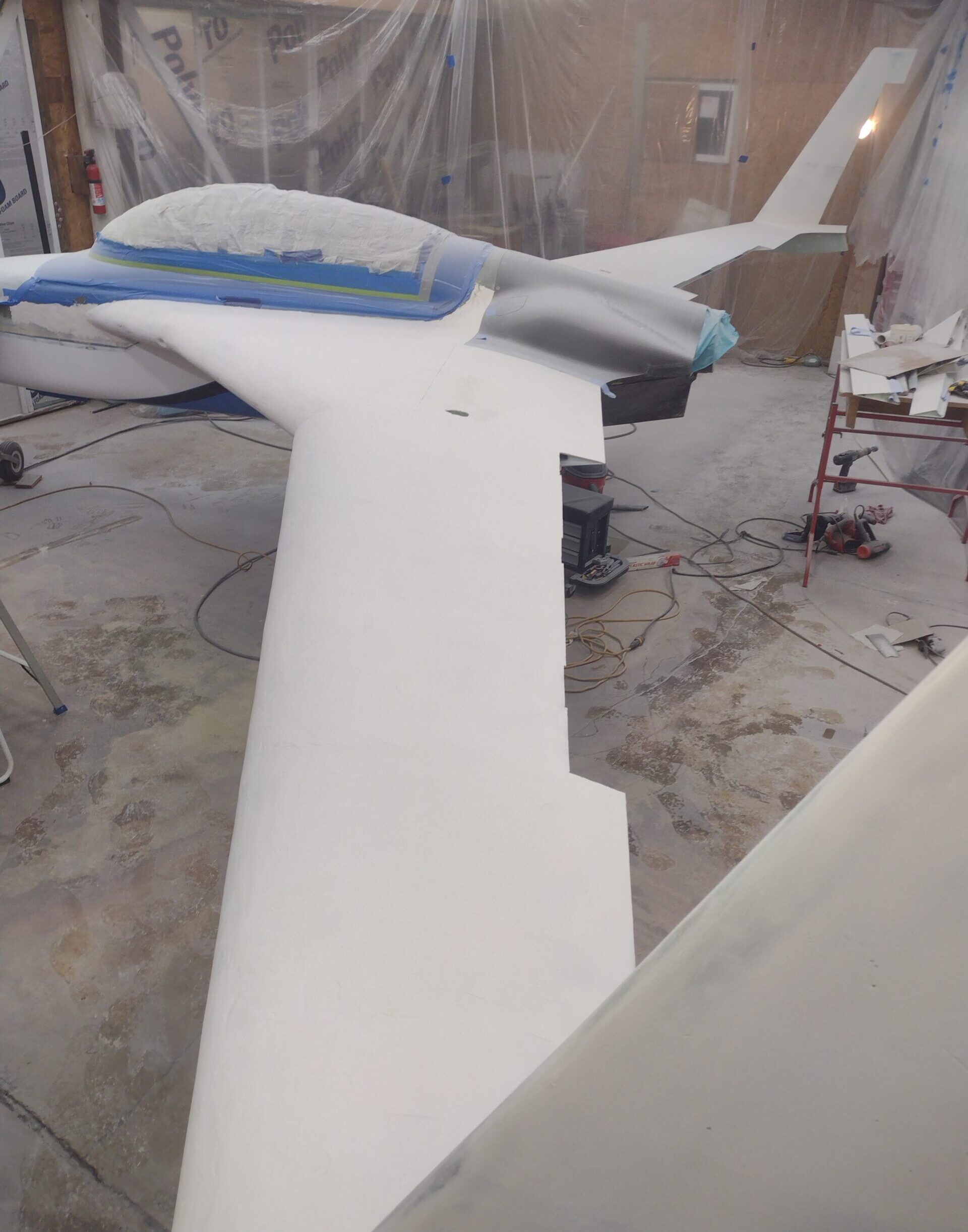 Left wing and strake top initial sanding to level, general shape Published 11 November, 2024 at 1920 × 2444 in Chapter 25 – Sanding ops commence!