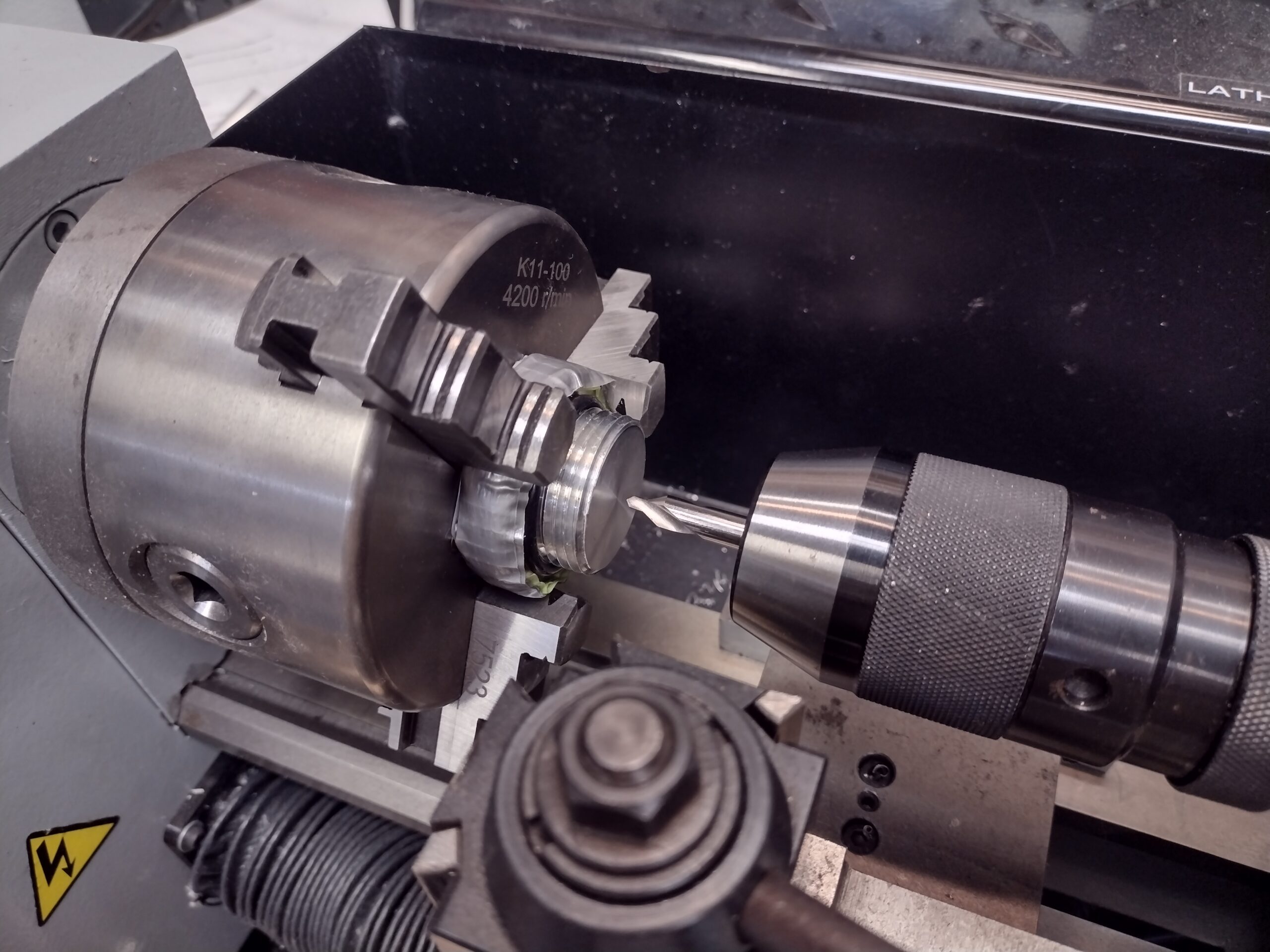 Threaded dipstick cap taped, chucked… ready for center drill Published 21 August, 2024 at 2560 × 1920 in Threaded dipstick cap taped, chucked… ready for center drill